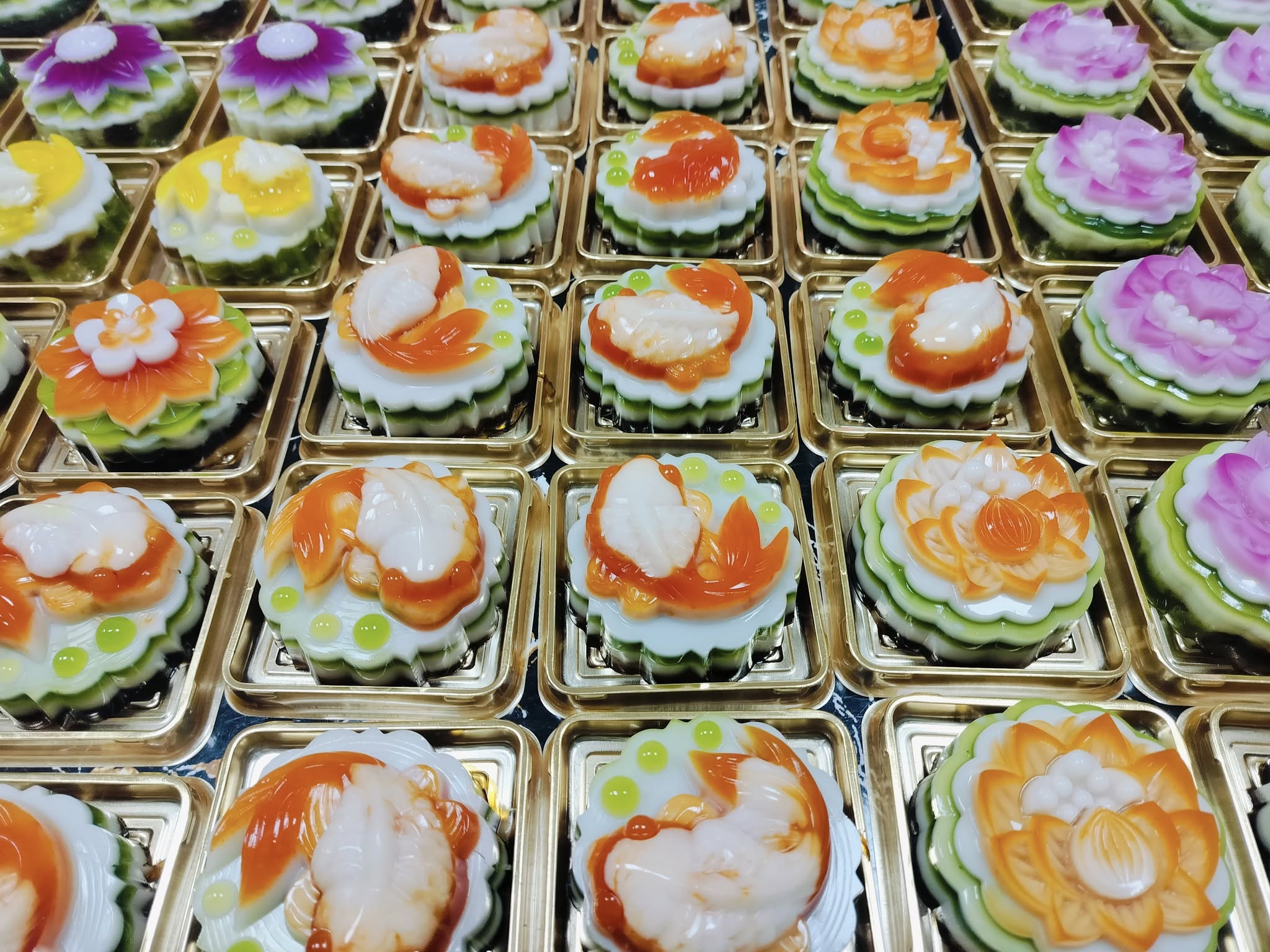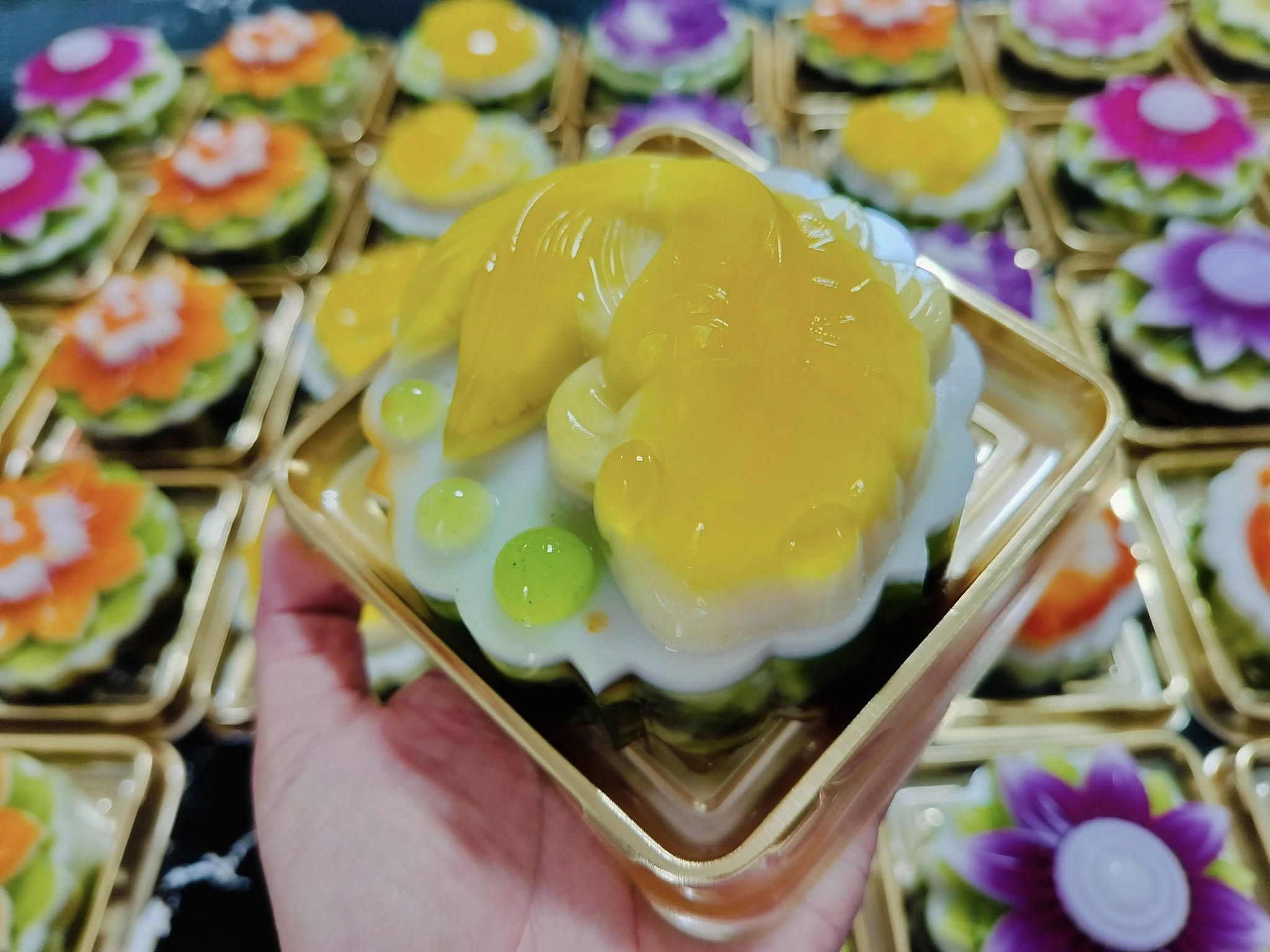 Đổ rau câu trung thu: Định hình rau câu theo dạng bánh trung thu mini.
