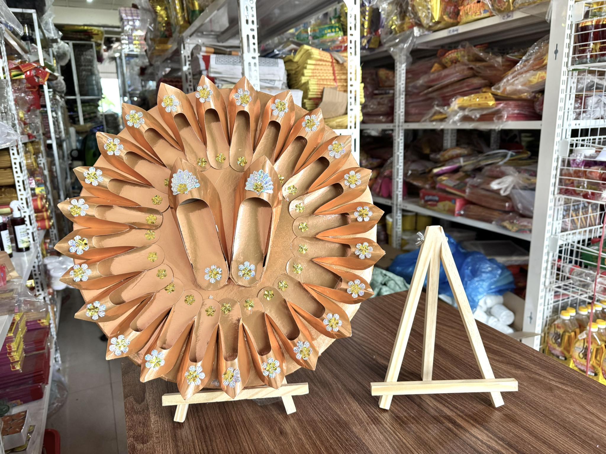 Chân kê hài mụ được làm từ chất liệu gỗ thông nhẹ, bền, giúp giữ vững vòng hài mụ, vòng hoa giấy trên bàn cúng một cách gọn gàng, đẹp mắt và trang trọng.